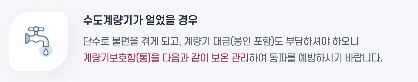 계량기보호통(함) 내부 보온 강화: 보호함 내부에 헌 옷이나 보온재를 채워 찬 공기가 스며들지 않도록 합니다.