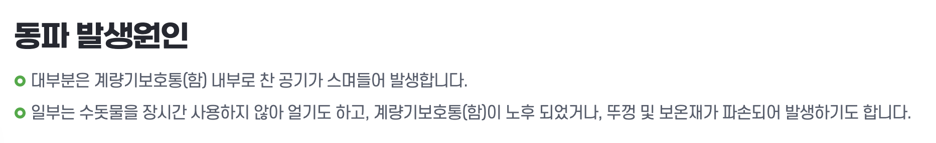 대부분의 동파는 계량기보호통(함) 내부로 찬 공기가 스며들어 발생합니다. 또한, 수돗물을 장시간 사용하지 않거나, 계량기보호통(함)이 노후되었거나, 뚜껑 및 보온재가 파손된 경우에도 동파가 발생할 수 있습니다.