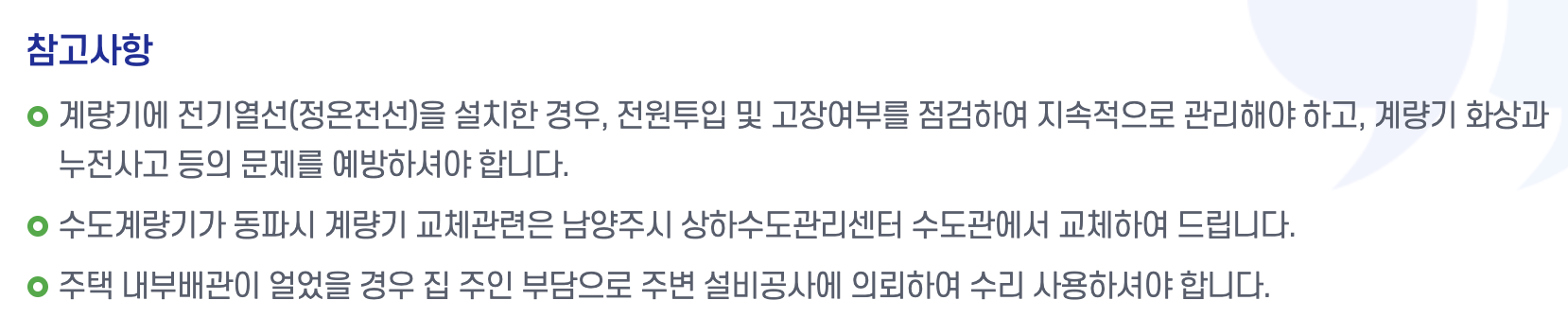 겨울철 한파로 인해 수도계량기가 얼어 동파되는 경우가 많습니다. 이러한 동파를 예방하기 위해서는 수도계량기의 보온 관리가 필수적입니다. 남양주시청에서 제공하는 정보를 바탕으로 수도계량기 보온 방법을 안내해 드리겠습니다.