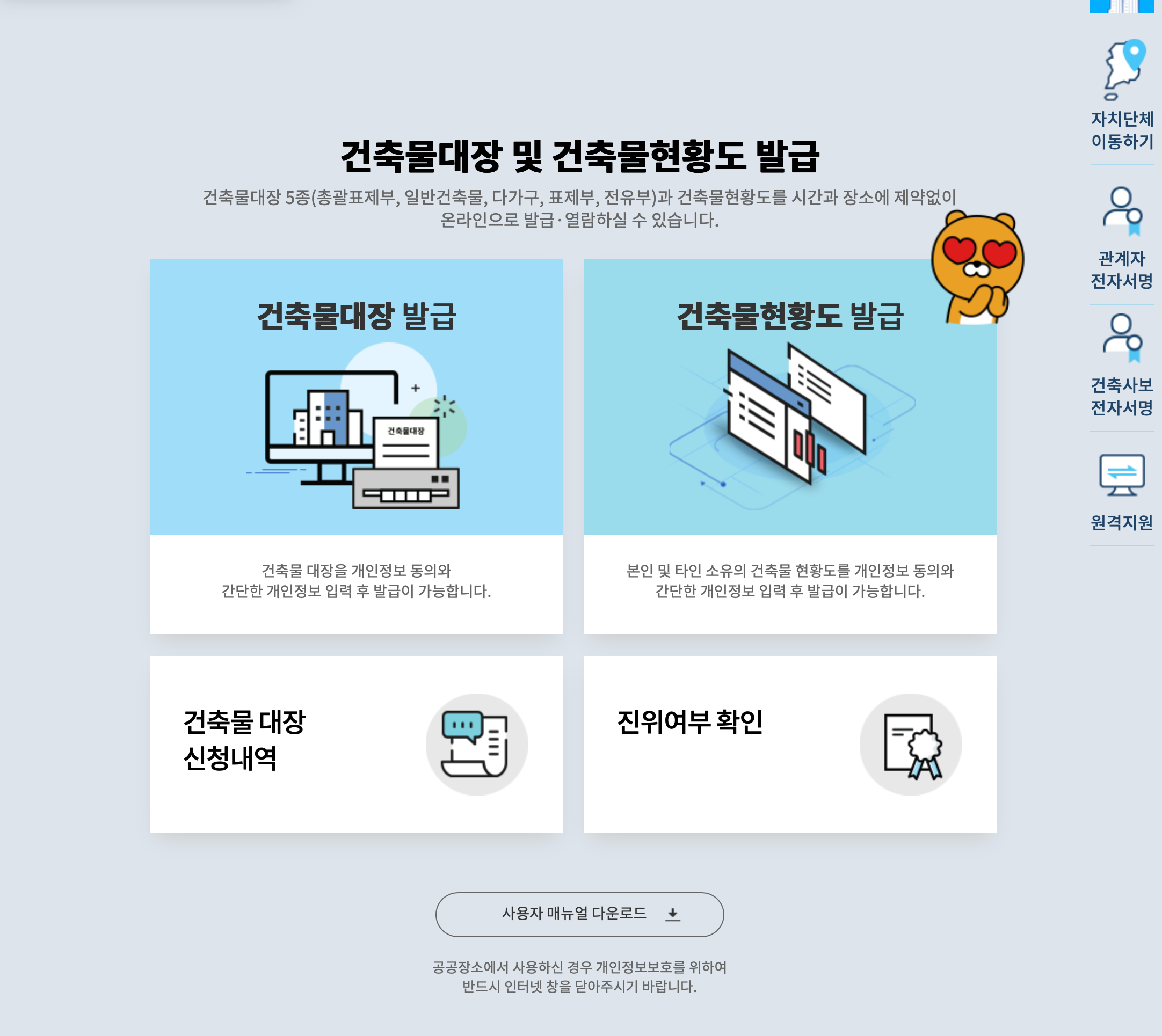 그럼 이렇게 건축물대장 및 건축물 현황도 발급 탭이 보이실 거에요.