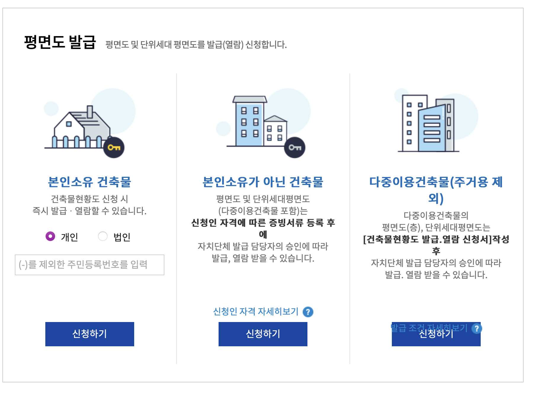 *만약 임차인이시라면 임차인 신청 + 임대차 계약서 첨부시 평면도를 받을 수 있습니다.