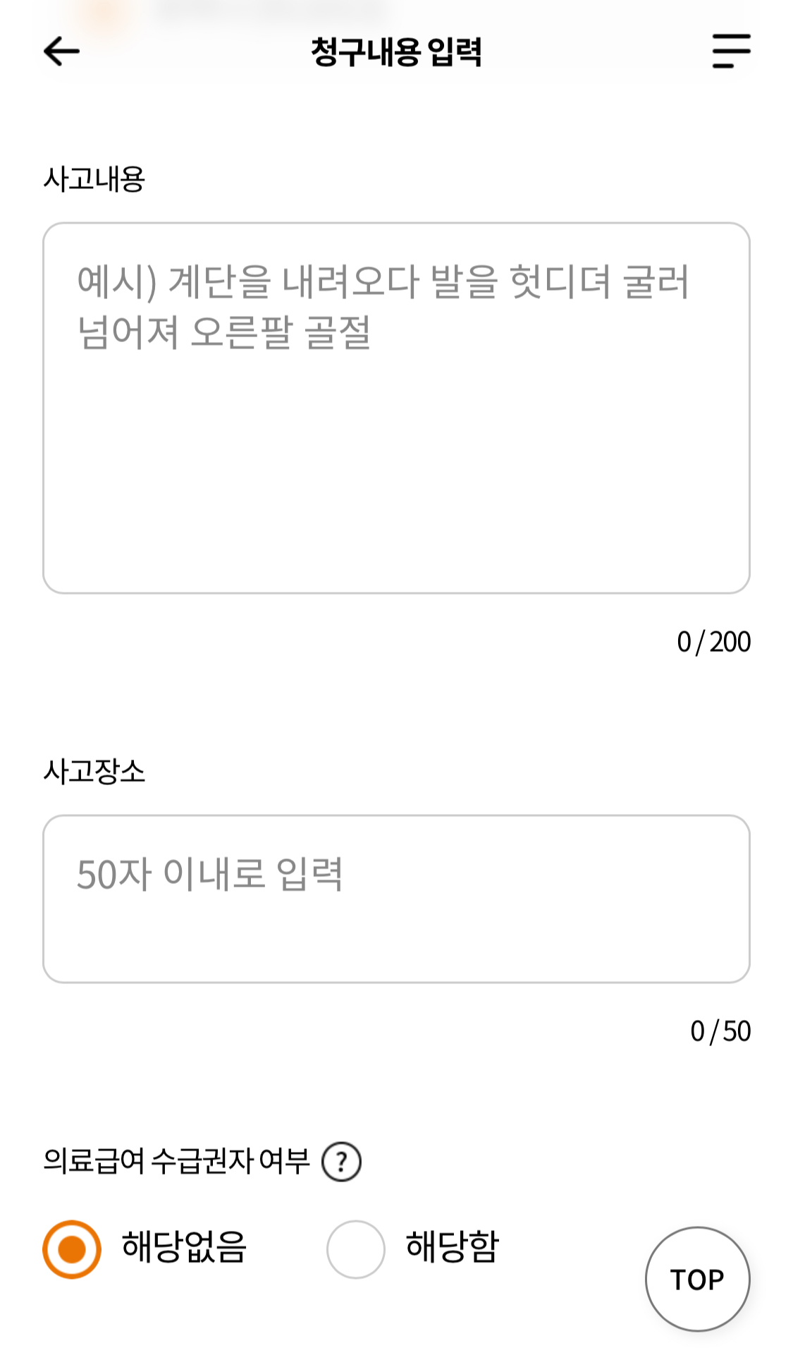 아래 의료급여 수급권자 여부도 해당없음과 해당함 둘중 하나 택1해주세요.
