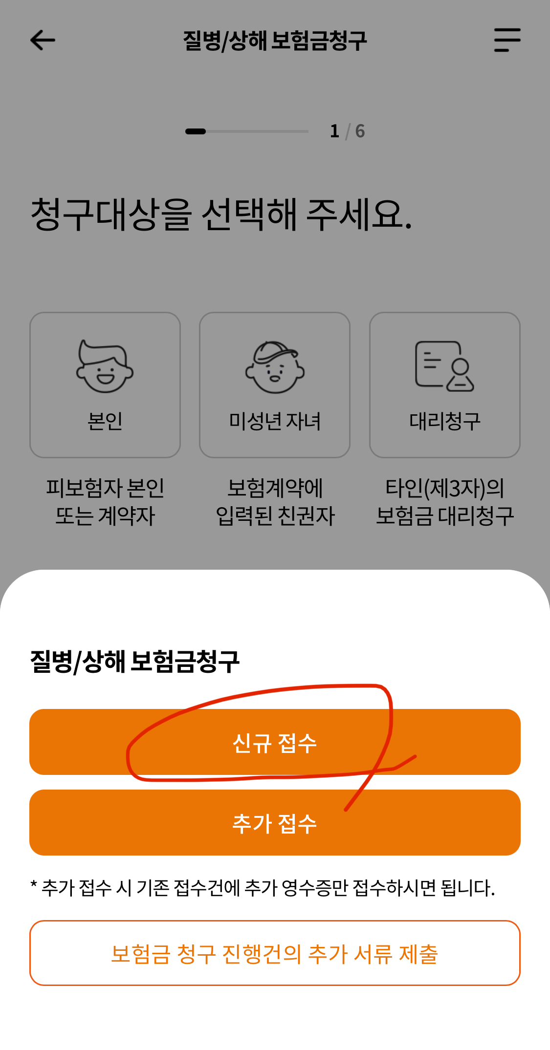 이전에 같은 원인으로 접수를 이미 하셨는데, 추가로 병원 내원 등을 해서 접수하시는 경우엔 '추가 접수' 선택해주세요.