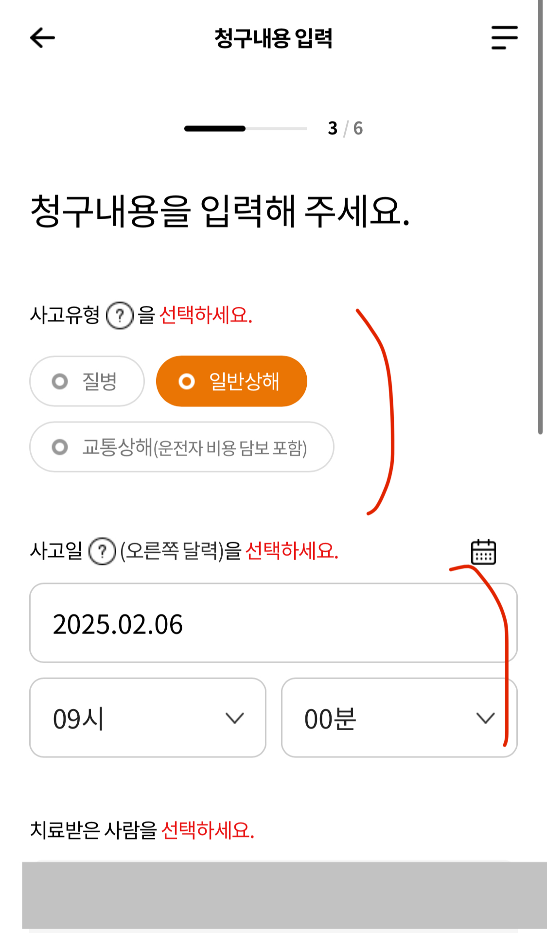 8. 사고 유형 선택(질병 또는 상해 또는 교통 상해 중 택1), 사고일, 치료받은 사람을 선택해주세요.