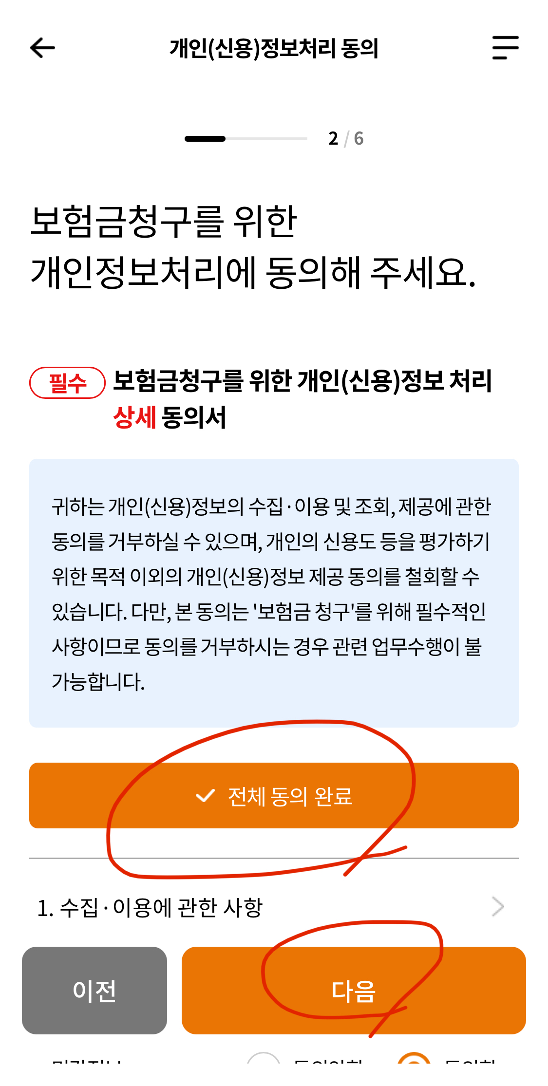 7. 개인 정보 처리 동의서 부분 전체 동의 완료 체크 후(팝업창 나온 거 전부 동의 누르시면 돼요),