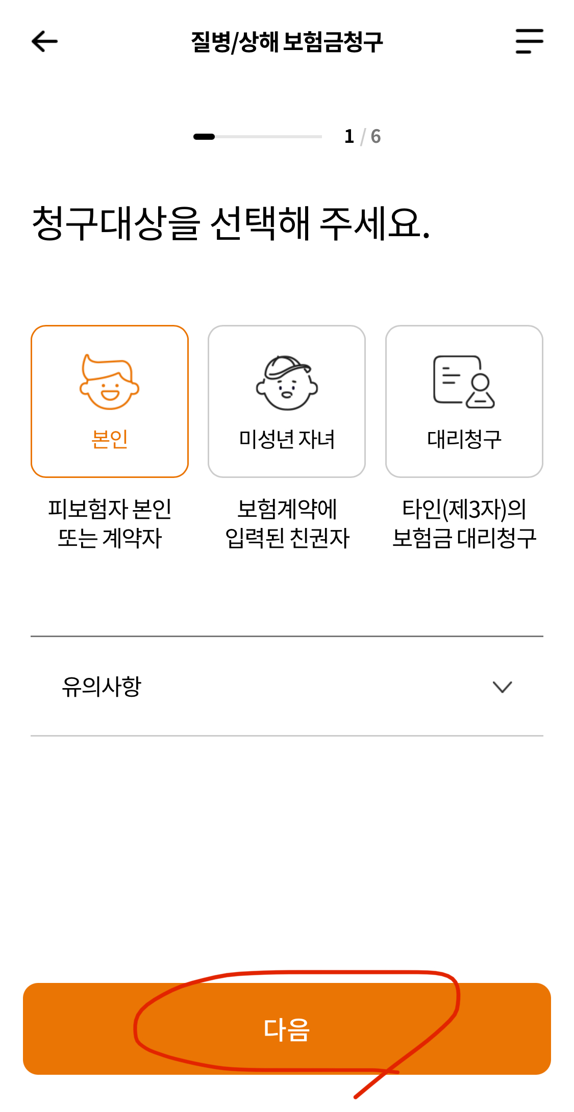 저는 제가 다친 거라 위의 질병/상해 보험금청구 선택했습니다.