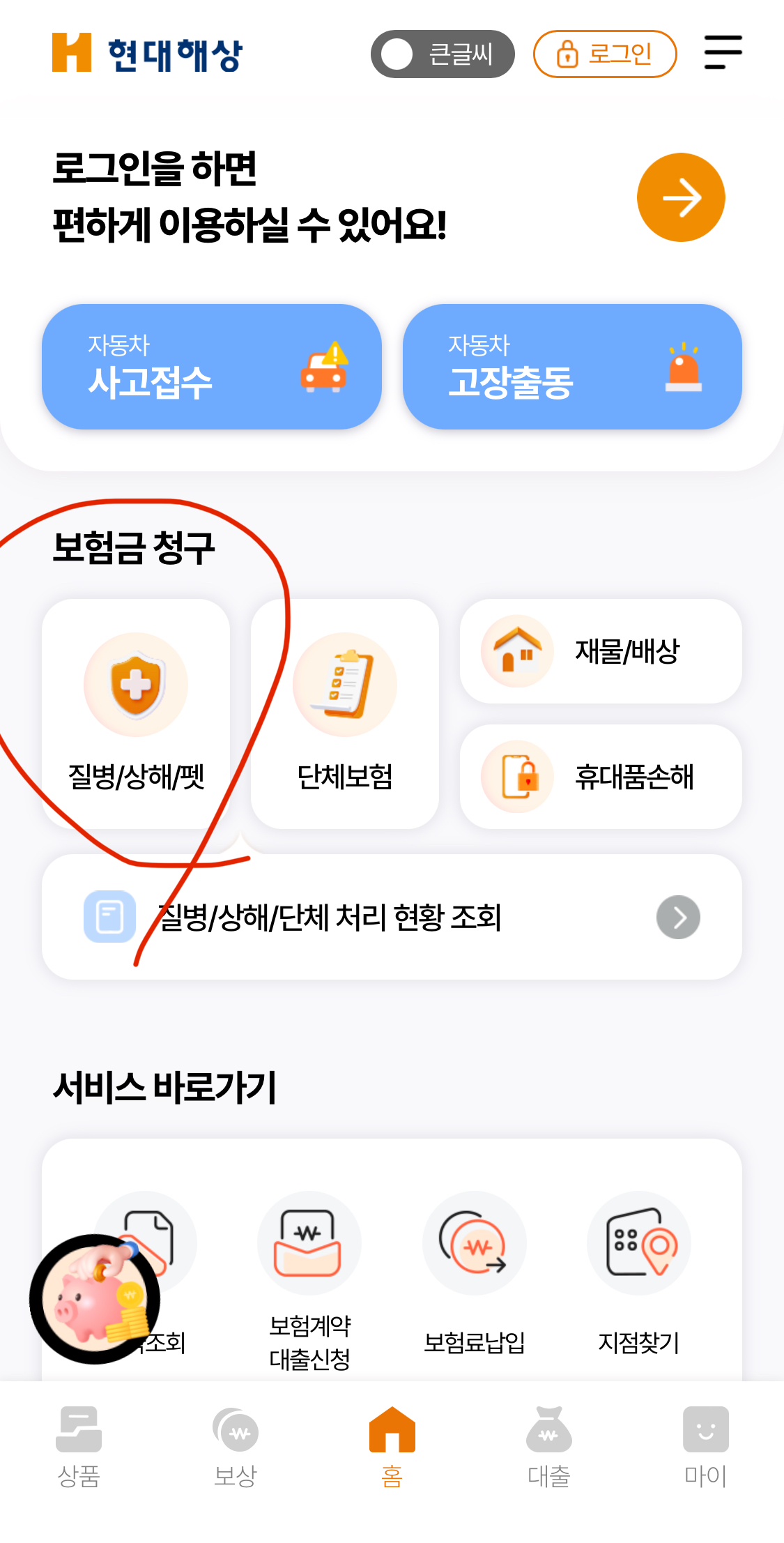 1. 어플 들어가셔서 메인 화면에 제가 동그라미 친 부분(질병/상해/펫)을 선택해주세요.